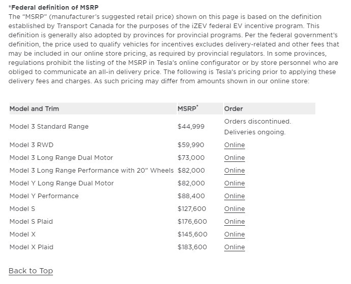 While the overall prices from the online configuration tool are important, it should be remembered that the official PDSF is the real number to determine eligibility for subsidies. This is the current model line-up and official Canadian prices from Tesla: