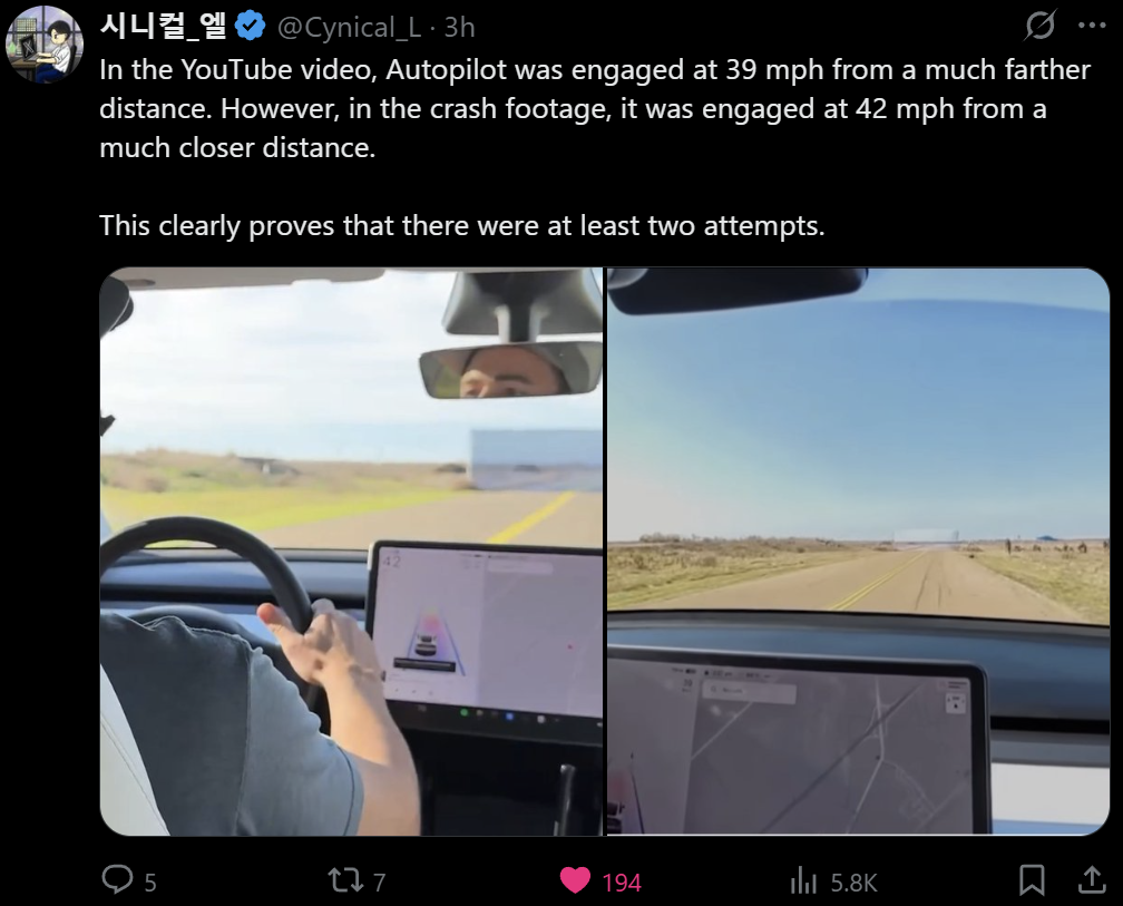 “In the YouTube video, Autopilot was engaged at 39 mph from a farther distance,” one user noted. “But in the crash footage, it was engaged at 42 mph from much closer. That’s not just a coincidence.”