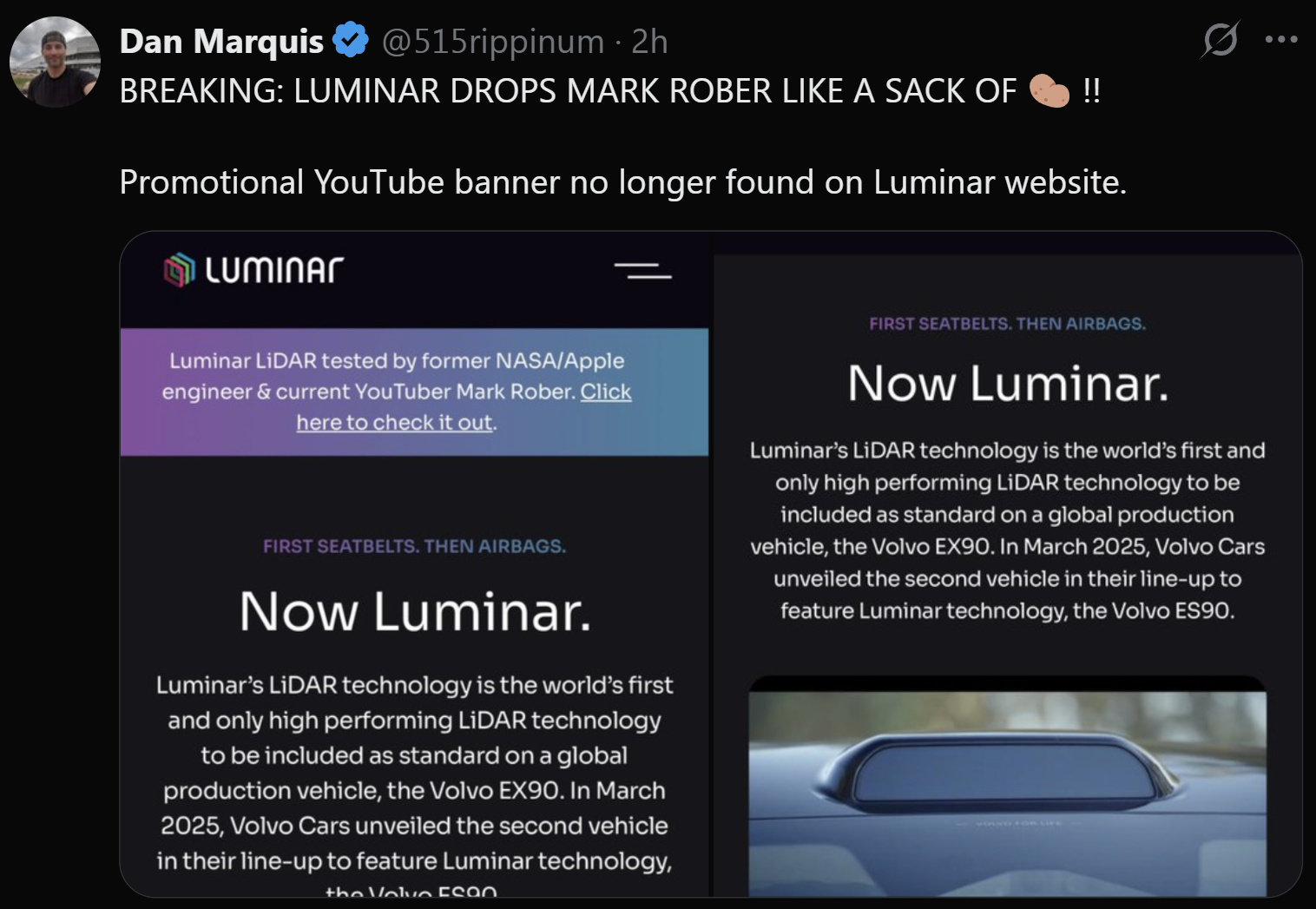 Oh my god. They're promoting 'Luminar LiDAR' tested by Mark Roberts, a video YouTuber that went viral today. Yes they were sponsors. Bad videos spreading misinformation. Unjust.* Luminar LiDAR tested by former NASA/Apple engineer & current YouTuber Mark Rober. https://t.co/KiILsvANsf pic.twitter.com/uZX87DJXJ4